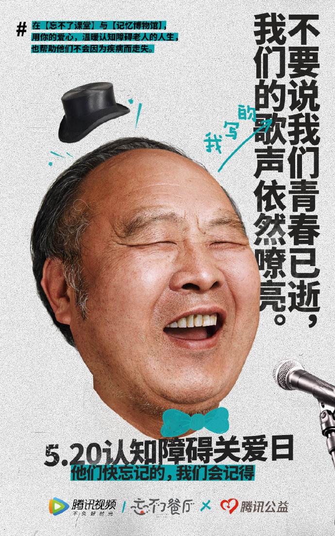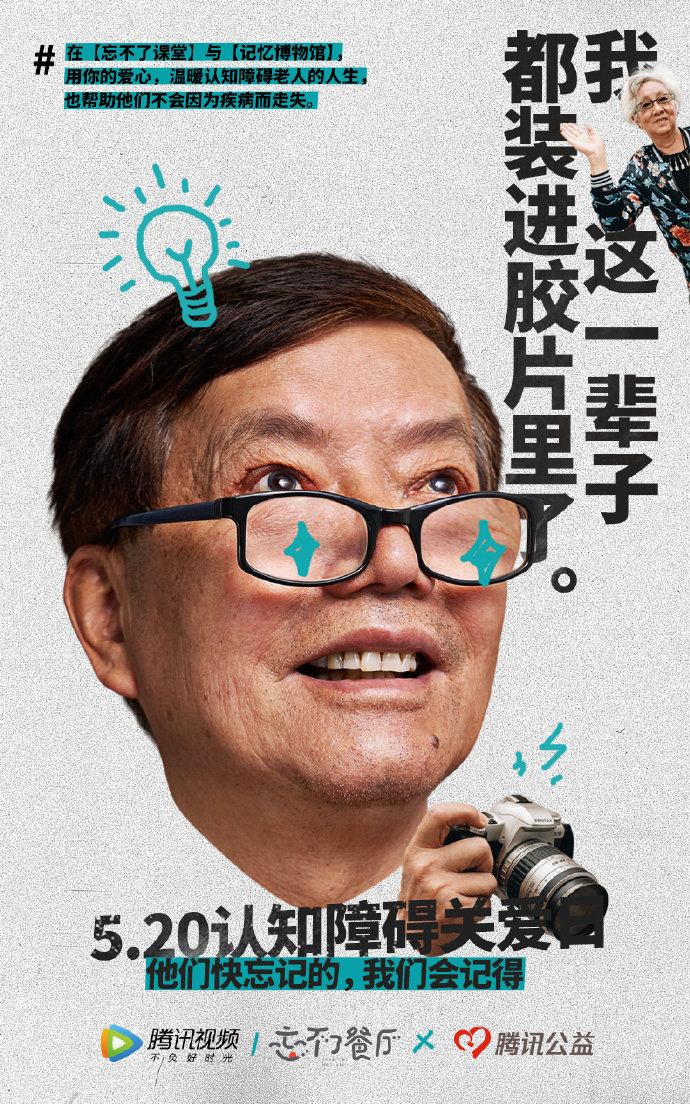 腾讯视频《忘不了餐厅》发起的公益捐款活动——“忘不了课堂”,通过五位患不同程度认知障碍的老人,分享自己的经历和知识。他们将真实的生活呈现在观众面前,为大家展示了认知障碍老人完全不同的一面。他们不仅不因为疾病而消沉,反而越发的热爱生活,而且愿意把自己最宝贵的生活经验教给年轻人。正如蒲公英奶奶所说:“哭也是过,笑也是过,我们为什么不能笑着过好每一天呢?”爷爷奶奶们积极面对生活、乐观面对人生的态度给了年轻人很好的榜样力量。他们参与各种社会活动,坚持年轻时的热爱,用一颗善良、可爱的心面对世界,用力所能及的方式保存自己与家人、爱人、朋友间的美好回忆。