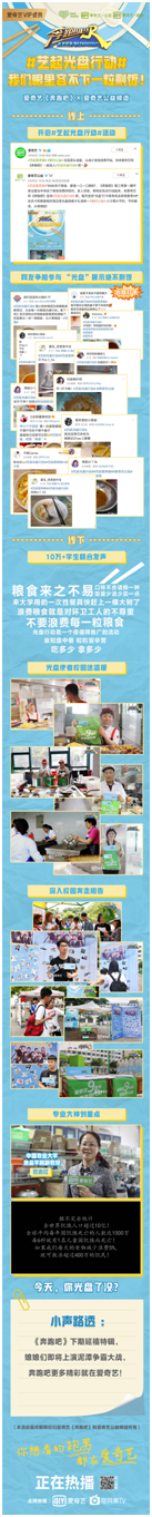 “5000多斤的粮食,都是一口两口剩下的”,诚如朱亚文和白宇发出的感叹,“很多人总觉得生活的便捷是理所应当的,但越是便捷,就越有人在背后默默付出”。爱奇艺《奔跑吧》“艺起光盘行动”旨在为节约环保真实发声,线上微博打卡和线下校园行联合助力达到了超出预期的理想效果。#艺起光盘行动#微博话题下,随处可见网友的“光盘照”实时打卡,网友纷纷表示支持与肯定“光盘行动,从我做起”。