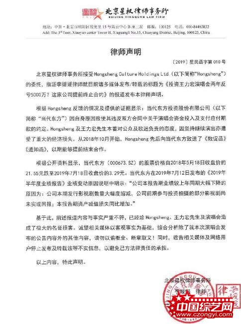 声明中指出,据公开资料显示:当代东方投资股份有限公司因从去年五月开始股票大幅跌落,公司市场价值仅剩下16%,以及其他投资项目亏损导致违反双方合同约定。而王力宏方则不愿歌迷失望继续坚持演出,同样遭受了巨额经济亏损。从去年10月开始,王力宏方先后向当代东方致送了《敦促函》《通知函》,希望能够提前结束合作,最终双方于2019年7月11日完成当代东方签署代理的14场演唱会后结束独家代理合作。这一因当代东方单方面原因导致的违约,反而被自媒体断章取义以偏概全,导致王力宏形象严重受损。