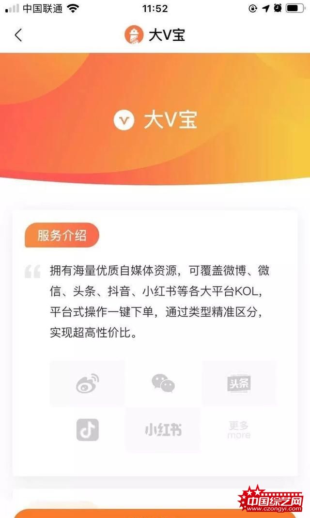在这款主打票房播报的软件中,有一个“大V宝”的按钮,上面写着,“拥有海量优质自媒体资源,可覆盖微博、微信、头条、抖音、小红书等各大平台KOL(Key Opinion Leader,意见领袖),平台式操作一键下单,通过类型精准区分,实现超高性价比。”该平台需要营销公司注册账号才能登陆,普通用户并不能直接看到更多内容。
