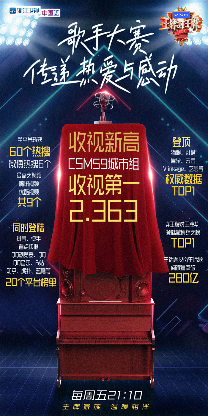本周《王牌对王牌5》收视再创新高,CSM59城市组2.363收视率,创2020开年省级卫视综艺节目新高!全网20个平台斩获60+个热搜,登陆腾讯、优酷、爱奇艺视频平台话题TOP1!节目话题词#王牌对王牌#登陆微博综艺榜TOP1,主话题及衍生话题阅读量突破280亿!