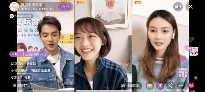 此次上线云发布会出席连麦的还有搜狐公司董事局主席兼CEO、搜狐视频CEO张朝阳,《亲密玩家》总制片人冯馨瑶,导演宋嘉峻,剧中扮演肖瑟的演员卫然担当小主播”与各位主创一一连麦,分享台前幕后花絮,并和剧中扮演凌双双的演员张颜舒开启“云陪看”,陪直播用户一起观看首播上线的剧集内容,引发高热互动。