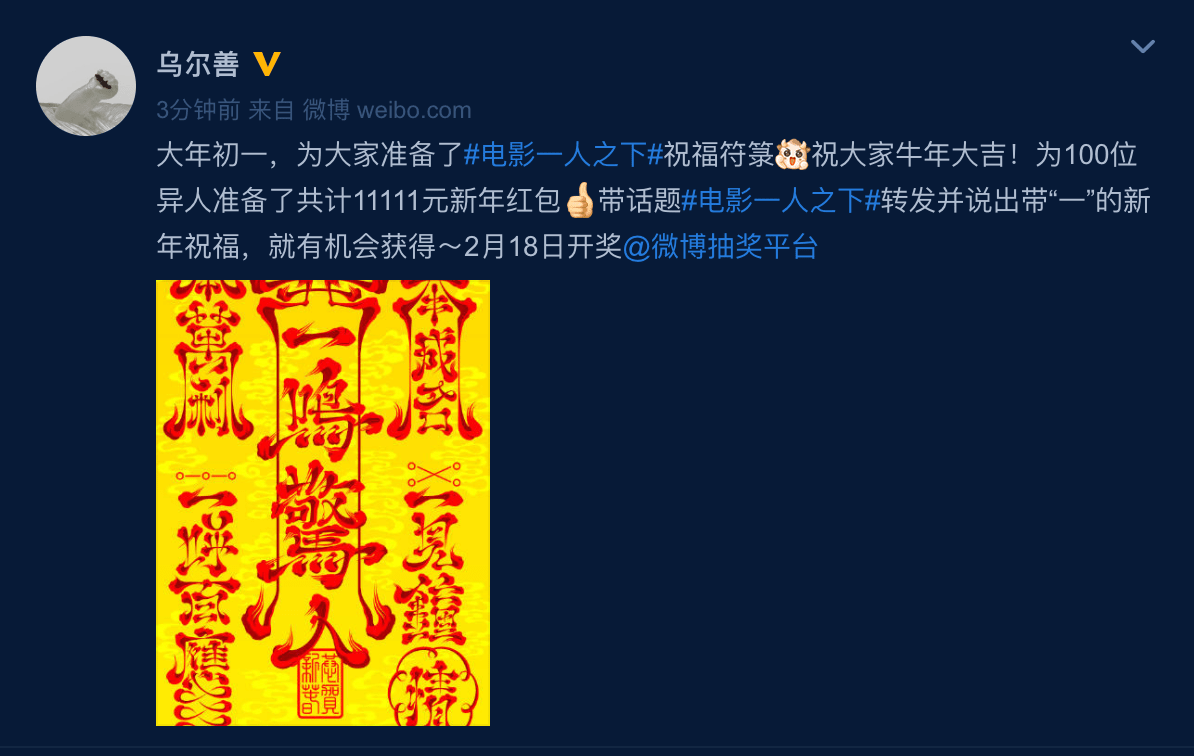 正值牛年大年初一,导演乌尔善在微博上晒出电影《一人之下》新春特别“定制”祝福符箓。为观众送上牛年“五个一”祝福的同时更送出了价值11111元的新春红包。随处可见“一”元素,让不少网友表示:这很“一人之下”。