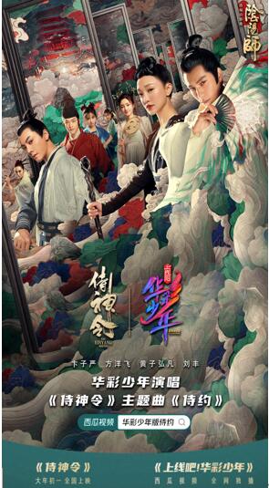 作为央视首档台网互动国风创演节目《上线吧!华彩少年》对中国传统文化的创新演绎,与电影《侍神令》中所营造的东方奇妙世界相得益彰。主题曲《侍约》MV中伴随着四位国风少年纯净且富有感染力的歌声,电影中的经典画面一一浮现,瞬间把听众带入到电影中的国风山河。