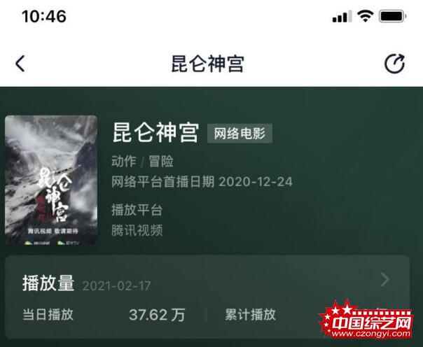 春节假期结束之际,由腾讯视频出品、上海浮生若梦影业制作的网络自制电影《昆仑神宫》播放量突破1.83亿,成2020上映的网络电影中播放量最高的作品之一。根据腾讯视频热度来看,《昆仑神宫》的热度一度位居腾讯视频电影排行榜热度第一,随后排位持续在腾讯视频网络电影动作/冒险类播放量前三。《昆仑神宫》根据“鬼吹灯”系列第四章改编,上线一周播放量破亿,腾讯平台打分8.0。随着播出时间进行,该片播放量一路呈现“高开高走”状态。据第三方平台数据显示,《昆仑神宫》上线55天播放量即突破1.8亿,打破由之前同类型作品创造的观影纪录,成为迄今为止“鬼吹灯”IP改编网络电影播放量上升最高的作品。