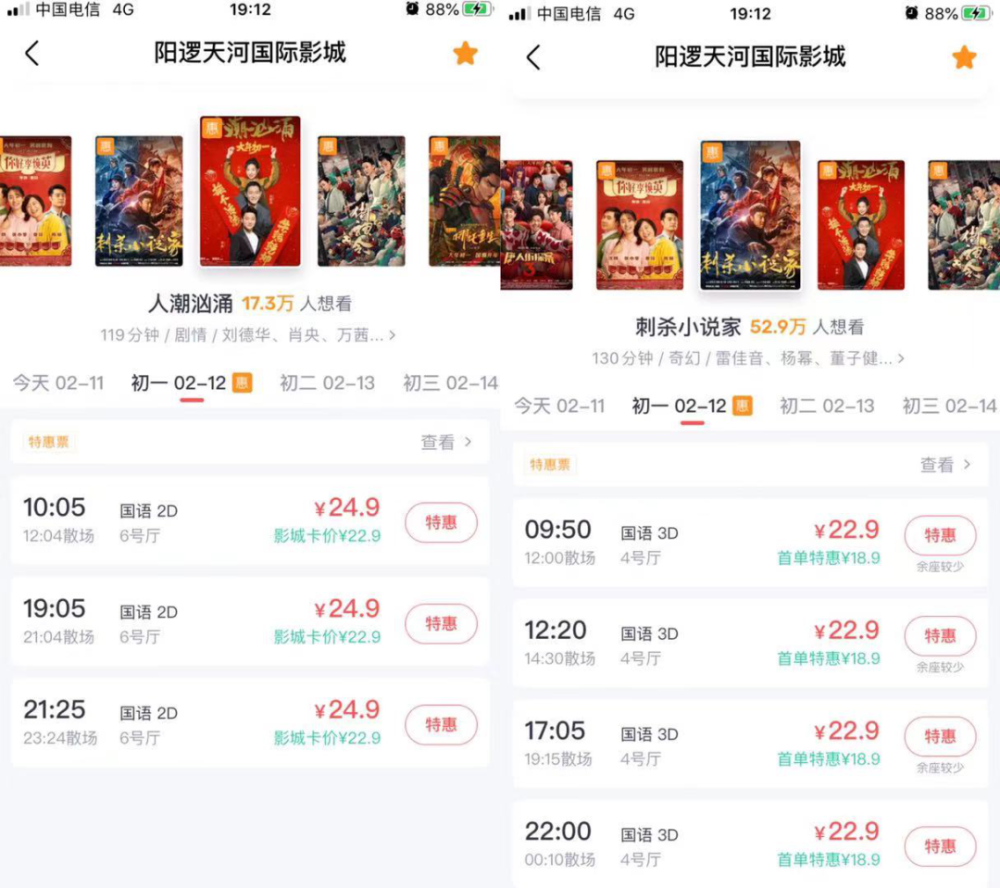 更意外的是,这种情况并不只初一一天,一直到大年初六,老家电影院黄金场次的电影票依旧需要拼手速或者提前一天至两天预定。“《唐探3》《李焕英》这些太热门了,我抢不到票。《刺杀小说家》这些倒是没人抢,但是场次太少了,还是买不着票。今天我想带我小侄子看个《狂野大陆》,还是没票。”