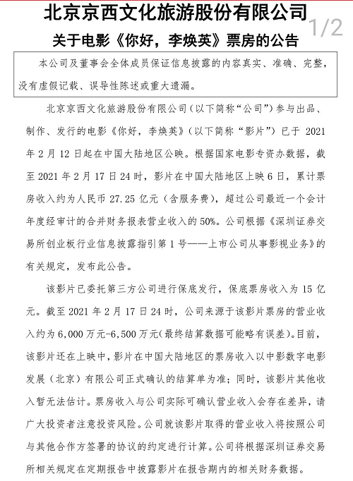 曾经,《泰囧》的爆火是个谁也没想到的意外,《战狼1、2》的成功也是吴京未曾预料到的,如今,《你好,李焕英》的大卖更是个所有人都没心理准备的个例,就连它的主控出品方北京文化都没想到,15亿就卖出了保底发行权。