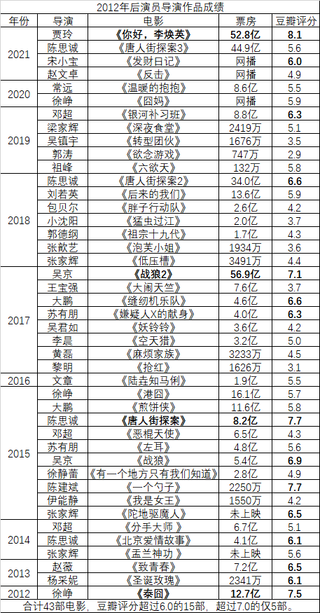 徐峥拍《泰囧》是为了施展自己的喜剧才华,吴京拍《战狼》是因为找不到导演给他拍,贾玲拍《你好,李焕英》是为了纪念妈妈,这些作品,一开始没有一部是冲着“我要当导演,我要赚钱”去的,反而取得了意想不到的成功。而那些精于算计,试图利用演员声名获取关注的导演作,虽然在那个泡沫时期也有卖得不错的,但没有一部真正大曝过。