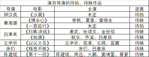 未来,还有钟汉良计划要拍的《沙漏》,秦海璐待映的《拂乡心》,吕聿来待映的《扫黑·决战》《桃源》,王学圻待映的《以父之名》,以及陈建斌的第二部导演作《第十一回》,涂们的第二部导演作《极恶不赦》等。