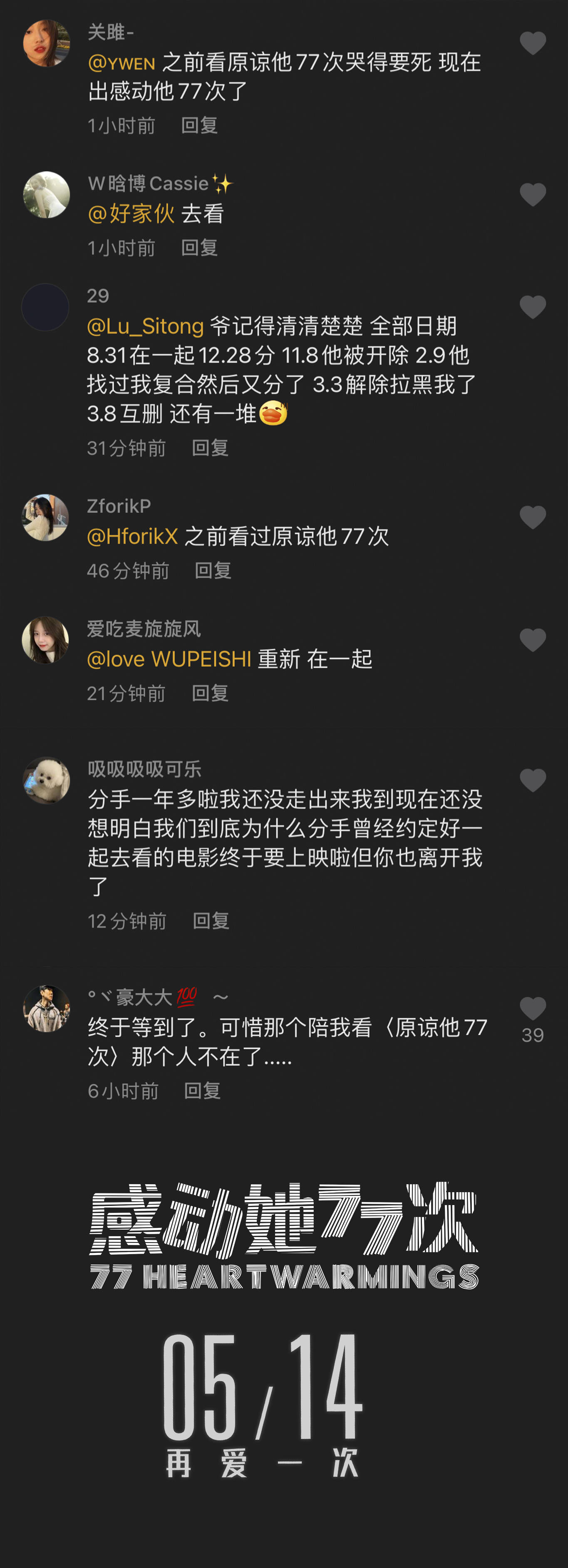 值得一提的是,网友还大玩谐音梗,将档期“514”音译成“我也是”。有网友惋惜:“终于等到了,可惜那个陪我看《原谅他77次》的那个人不在了……” 亦有网友感慨:“《原谅他77次》是第一次一个人去看的电影,如今四年了,这次我还会是一个人看吗?”还有网友隔空喊话未来的那个人:“原来看《原谅他77次》已经是四年前的事了。总会有新的人陪你看新出的电影,如果你有空的话,要不要快点出现。”而更多的人则将“514,我也是”作为观影暗号,与心爱的人约定5月14日一起去看《感动她77次》,仪式感满满。