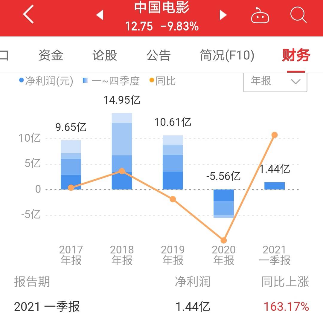 2020年,中影净亏损5.56亿元,是其上市后的首次亏损。今年一季度,实现盈利1.44亿元,展现了较强的恢复能力。