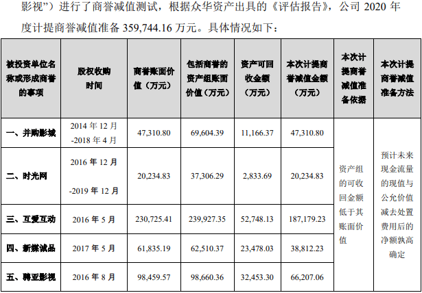 这其中商誉减值准备为35.97亿元,主要是万达电影曾经并购影城、时光网、互爱互动、新媒诚品、骋亚影视产生的商誉。