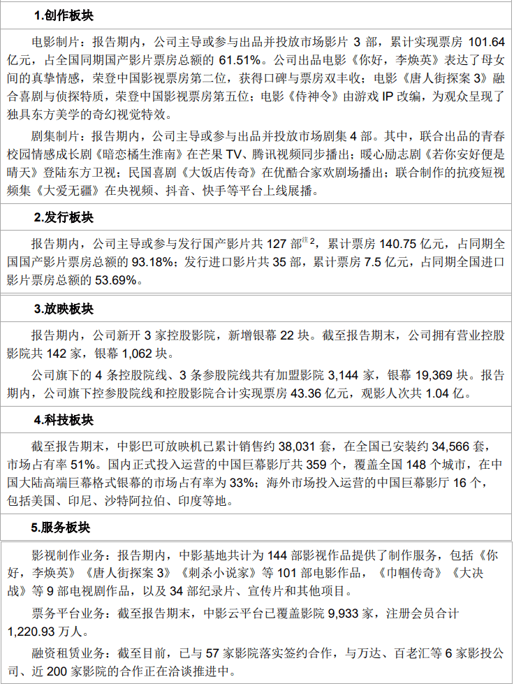 电影方面,中影报告期内上映了《你好,李焕英》《唐人街探案3》《侍神令》。电视剧方面,主导或参投的剧集包括《暗恋橘生淮南》《若你安好便是晴天》《大饭店传奇》。