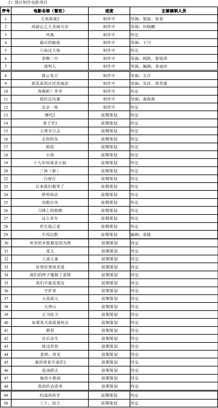 预计制作的电影项目多达50部,包括《大鱼海棠2》《哪吒2》《姜子牙2》《西游记之大圣闹天宫》《凤凰》《最后的魁拔》《三体(新)》《白夜行》《火神山》《谁的青春不迷茫2》等。