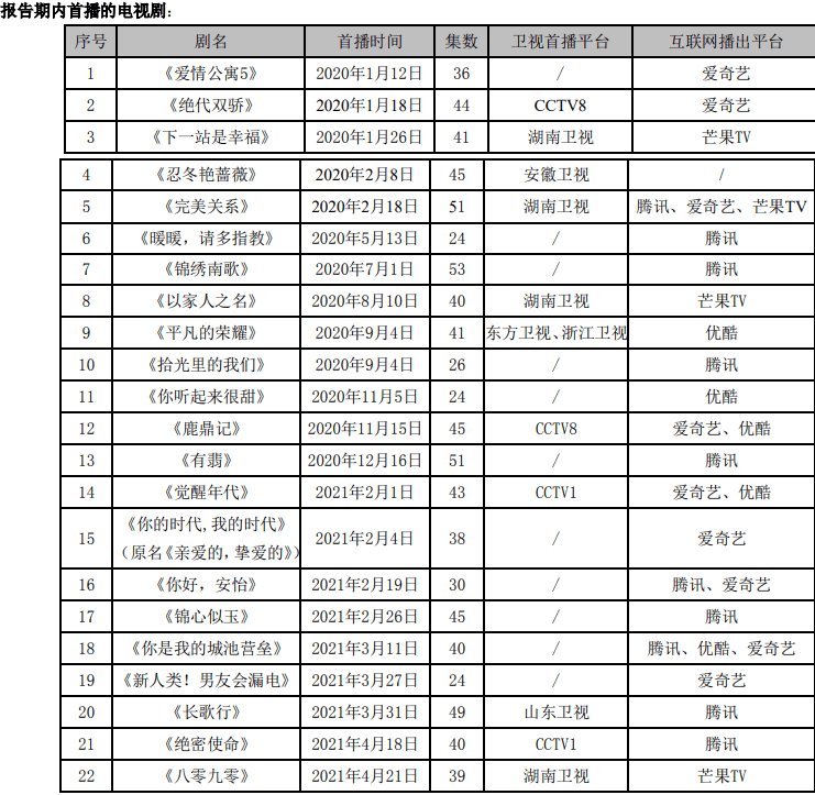 报告期内,确认了电视剧《长歌行》《你是我的城池营垒》《锦心似玉》《你好,安怡》《觉醒年代》的收入,以及电影《刺杀小说家》的收入,另外还有艺人经纪、音乐、广告、游戏授权等衍生业务的收入。