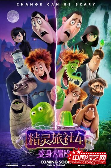 此次发布的“全员变身”海报将画面一分为二,左边一列正是他们的原始形态,德古拉、约翰尼、梅菲斯、木乃伊莫瑞等大家熟悉的角色都位列其中,而画面右边则是他们变身后的样貌,除了约翰尼变身成为绿龙,其余几位都变成了人类。