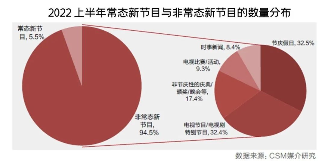 非常态节目的创新比例达到94.5%,其中以元旦、春节、清明、五一、六一、端午等为主题的节庆假日类新节目,和电视节目/电视剧特别节目所占比重最高,均超三成。