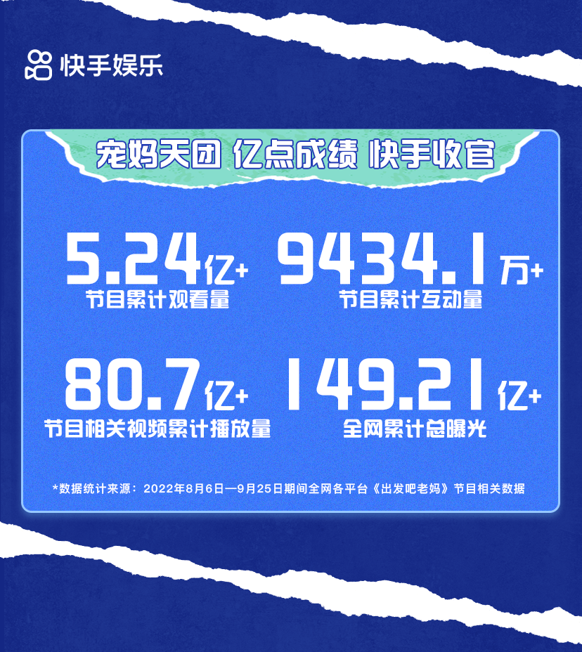 9月24日,由快手娱乐出品的创新代际互动真人秀《出发吧!老妈》正式收官。据悉,该节目以大张伟的“宠妈”之旅为主线,在轻松快乐的基调中带老妈解锁年轻新体验,同时在不同类型母子的交流与碰撞中,折射出当下代际沟通的痛点,并尝试给出全新答案。截至9月25日,8期节目累计观看量超5.24亿,累计互动量高达9434.1万,相关话题视频累计播放量超80.7亿,节目在全网累计总曝光超149.2亿。与此同时,节目热议话题不断出圈,全网热搜热榜超140个,高位霸榜话题34+。其中,#蔡明不建议给年轻人建议#、#柳岩劝妈妈们自私一点#、#大张伟说我的事业没那么重要#等话题引发全网讨论,在微博、抖音等社交平台热度居高不下。