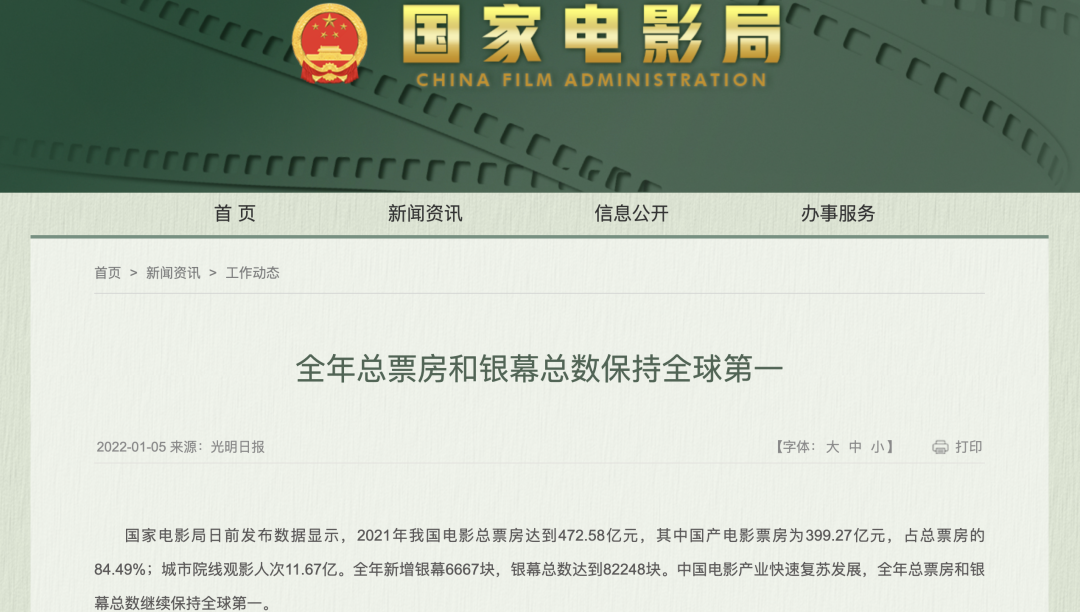 2021国产电影票房为399.27亿元,占到总票房的84.49%,全年票房前10名影片中,有8部国产。