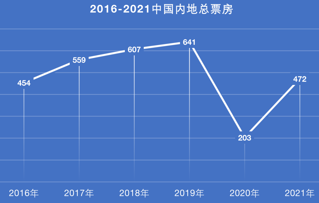 受疫情影响,2020年全国电影总票房只有203.14亿元,较2019年的641.49亿元票房减少68.3%。而2021的数据是472.58亿,与2019年相比,恢复了七成多。