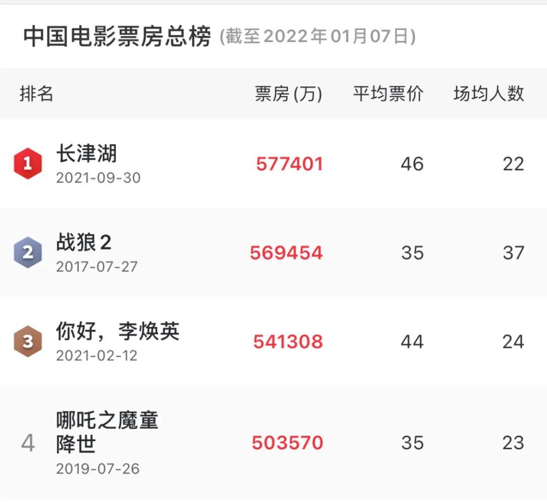 《长津湖》和《你好,李焕英》,中国影史票房第一名和第三名,都出现在2021。