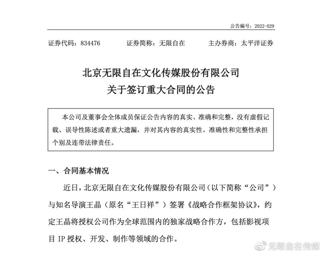 同此同时,无限自在也与贾樟柯、王晶、管虎、陆川等优秀导演保持合作。2022年10月,无限自在发布签订重大合同的公告,为拓展公司影视板块业务,进一步增强综合实力,公司与香港著名导演王晶签署了《战略合作框架协议》,依托无限自在内容产出的布局、新娱乐营销的优势以及王晶的影响力,双方达成合作意向。
