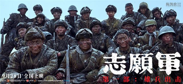 与主题曲MV同时发布的,还有一组“无名战士”海报。海报上没有任何一个明星“熟脸”,只有一张张充满朝气的战士面孔,电影以此来致敬抗美援朝战争中的无名英雄。两张海报,一张是战斗打响前,战士们脸上带着笑容,满怀希冀;另一张则一扫明快的氛围,战士们脸上、身上都有战斗过的痕迹,表情也不再轻松。一明一暗的对比,突显战场的残酷,战士们在最青春的岁月,经历着最严苛的考验。