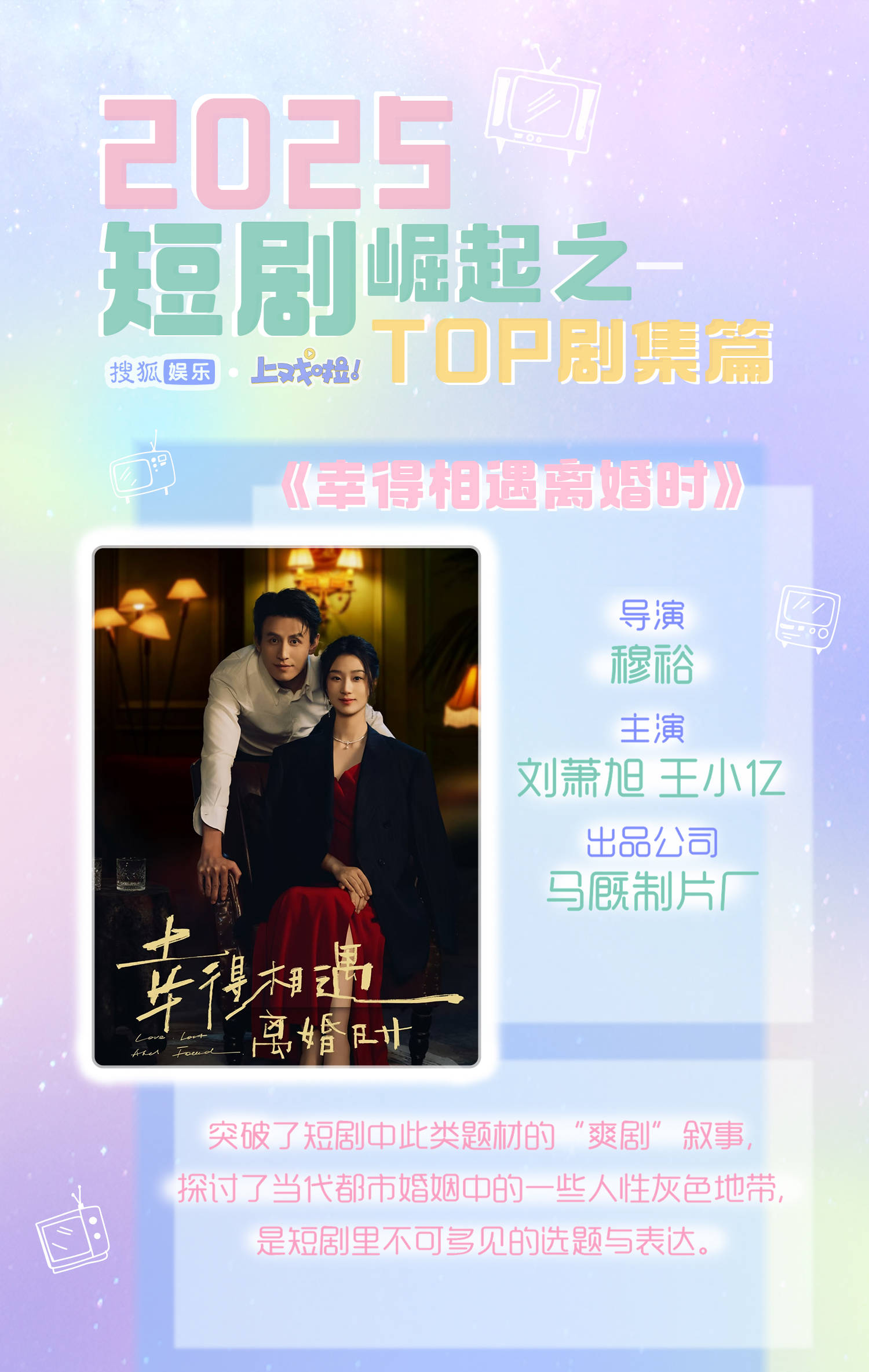 刘萧旭、王小亿出演的《幸得相遇离婚时》首日上线就登顶红果平台热播榜、热搜榜、新剧榜、付费榜四榜首位,上线7天播放量突破10亿,是去年秋季档短剧市场表现最亮眼的一部现偶题材。而这部剧在去年婚恋题材的短剧序列里,是一个尤其特殊的存在,以 “离婚” 为起点,实则书写了两个灵魂的双向救赎,男主重构了“霸总”的人物内核,女主也跳出了“人妻”的统一人设,两个人都被放置在成年人的立场上,面对对于婚姻的复杂和人性的深邃,拿出了自己最睿智的解决方式。《幸得相遇离婚时》突破了短剧中此类题材的“爽剧”叙事,探讨了当代都市婚姻中的一些人性灰色地带,是短剧里不可多见的选题与表达。
