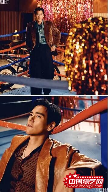 拍摄现场,拳击台的场景令人不难联想到彭于晏的电影《激战》,他身着黑色西装俯身撑在围绳上,锐利眼神仿佛随时准备迎接综合格斗的挑战。复古棕黄皮质外套搭配波点衬衫,松弛中带着不羁,亦或是战斗胜利之后的轻松。镜头下,彭于晏用拳击绷带缠绕手部,熟练的手法是过往的角色留下的印记。蓝色衬衫搭配橙色绷带的特写,动作里带着训练后的惯性。这些细节都在诉说演员与角色的共生关系。在另一组照片中,彭于晏身着豹纹长款风衣伫立于 “2026” 字样的气球前,硬朗与华丽碰撞出强烈视觉冲击。手持蛋糕的画面,宛若一部电影终场戏的杀青镜头,完美诠释了 “片场内外” 的状态切换。