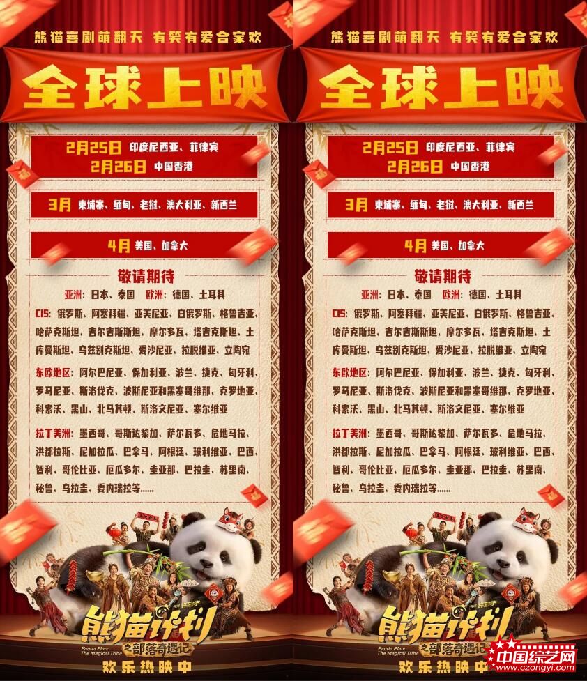 凭借“萌主”熊猫胡胡和“国际巨星”成龙的“双国宝”组合、高认知度的喜剧人阵容,以及充满欢笑的奇幻剧情,2026年春节档合家欢喜剧《熊猫计划之部落奇遇记》自国内上映以来便备受瞩目。随着影片在东南亚国家、中国澳门地区陆续开画,这股融合了喜剧、冒险与原始部落元素的欢乐风暴迅速席卷海外,不仅在多个市场创下华语片票房佳绩,更收获众多海外观众与媒体的好评。如今,这部独具东方文化特色的熊猫喜剧乘胜追击,将在3月陆续登陆柬埔寨、缅甸、老挝、澳大利亚、新西兰银幕,同时计划于4月在美国、加拿大及俄罗斯上映,开启全球“部落冒险”新篇章。